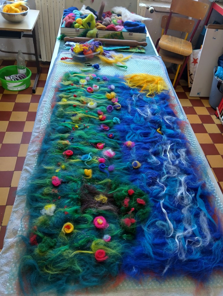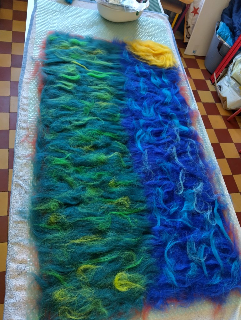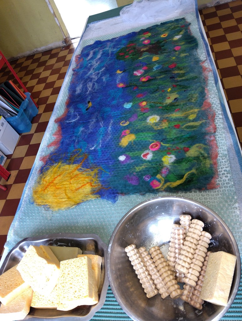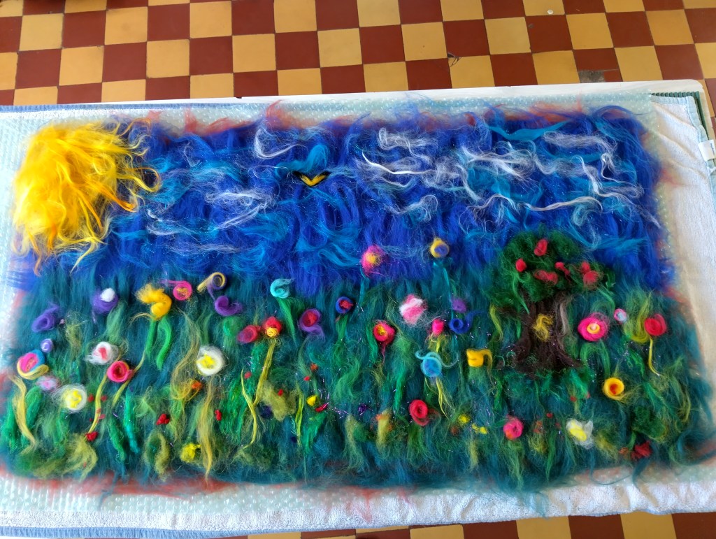 Voici les étapes de réalisation d’un petit tableau textile, en feutrant de la laine de mouton et autres fibres d’embellissement (fibres de soie, bambou), simplement grâce à du savon, de l’eau tiède, et de l’énergie !
