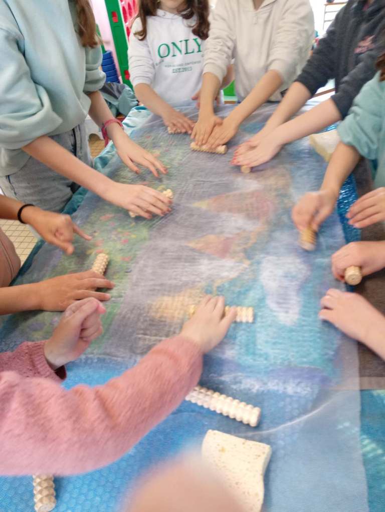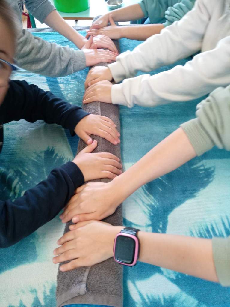 Voici la création d’un tableau de paysage montagneux, sur la base de dessins imaginés par les enfants.