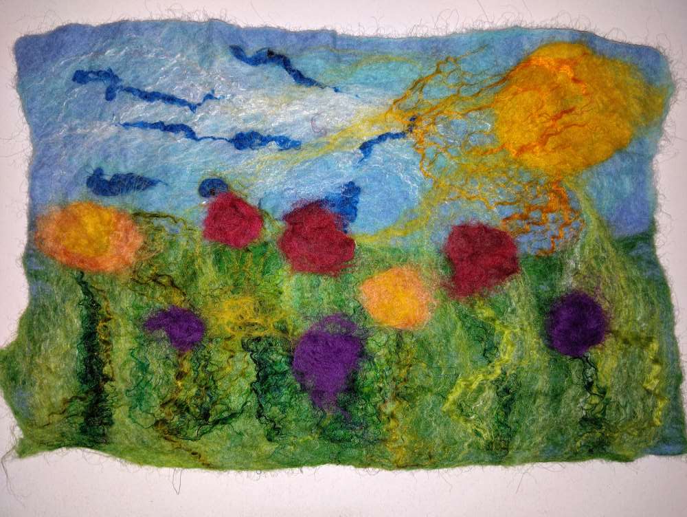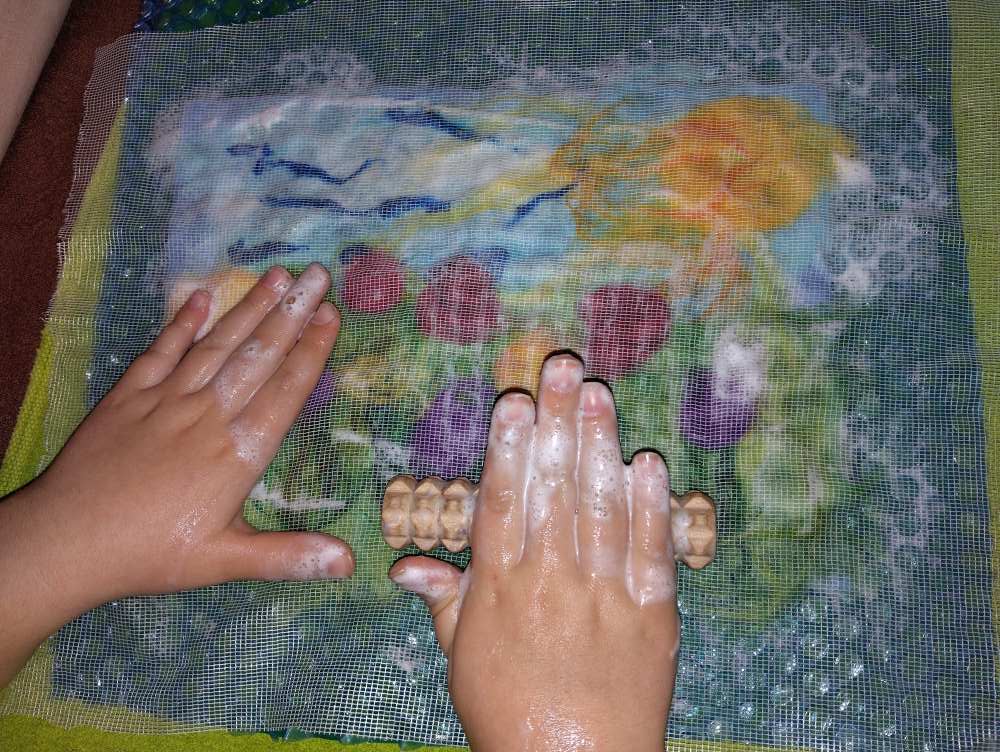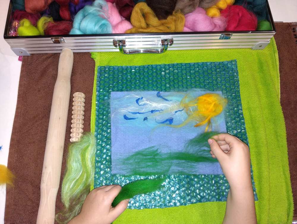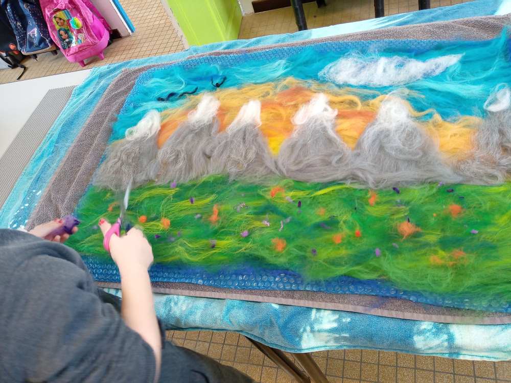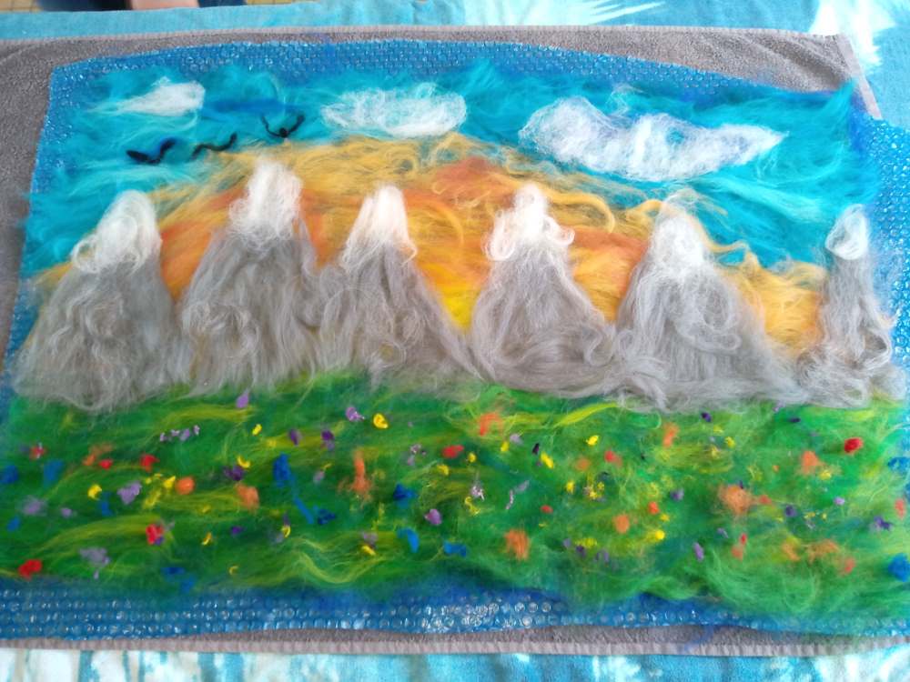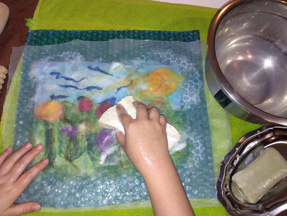 Voici les étapes de réalisation d’un petit tableau textile, en feutrant de la laine de mouton et autres fibres d’embellissement (fibres de soie, bambou), simplement grâce à du savon, de l’eau tiède, et de l’énergie !