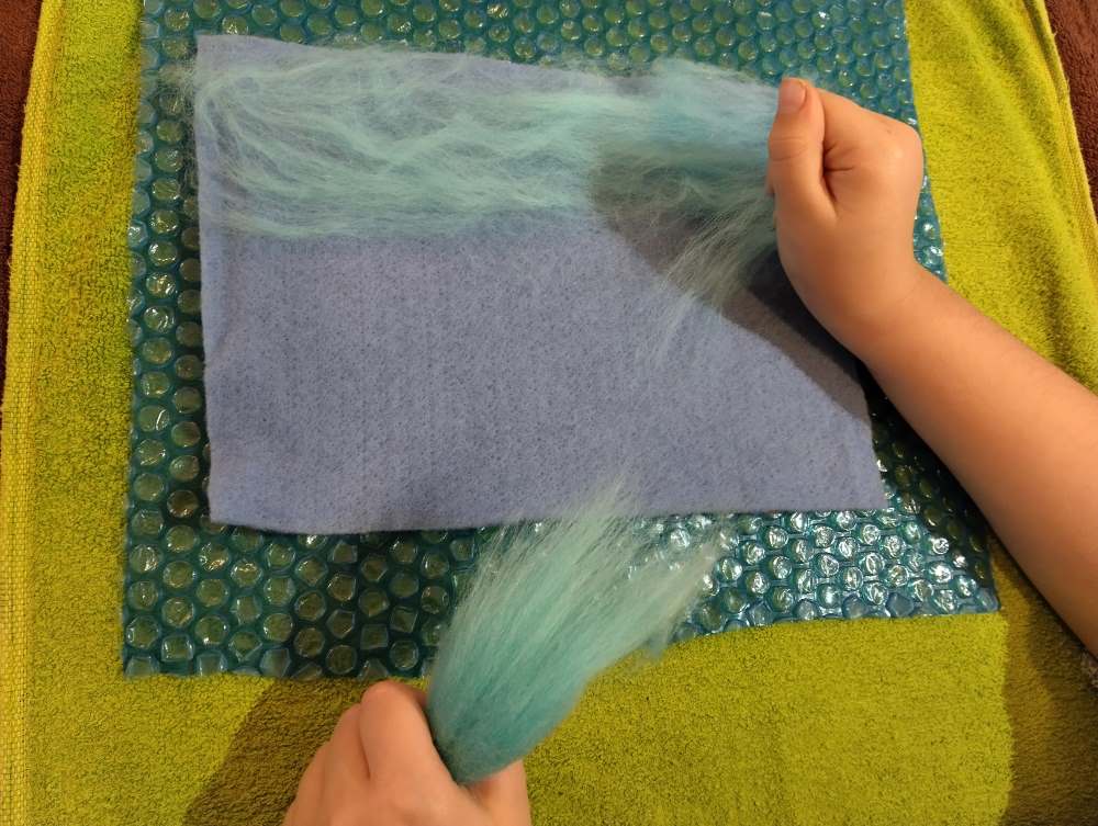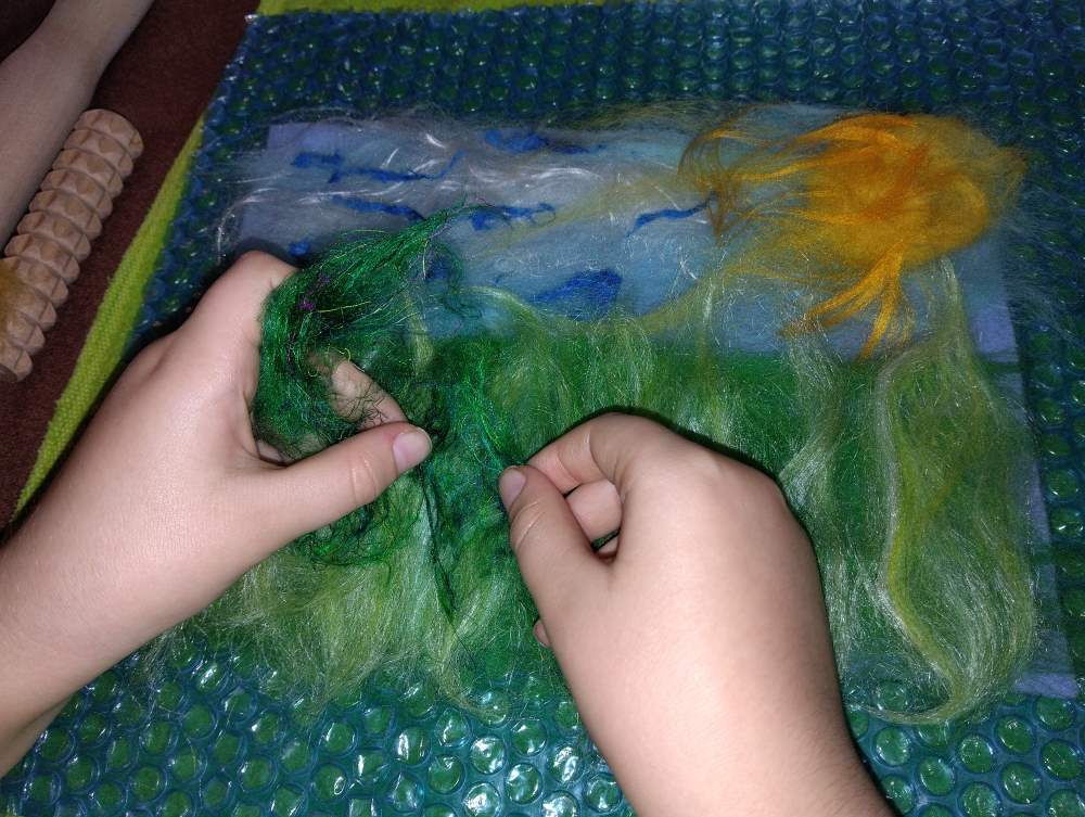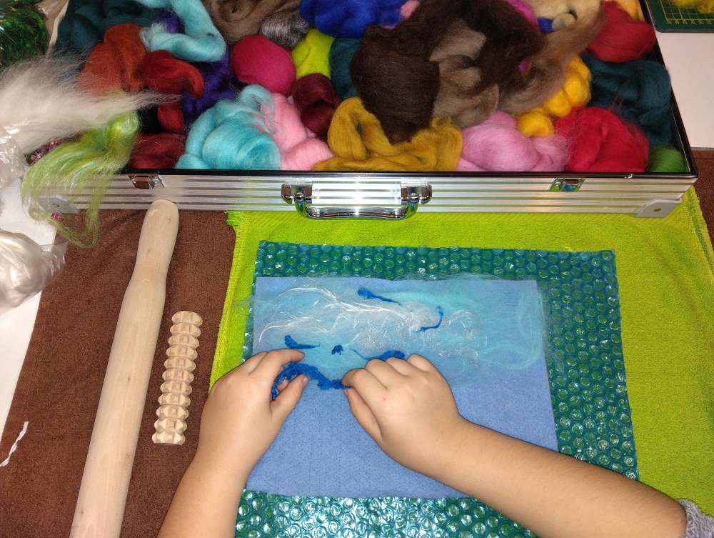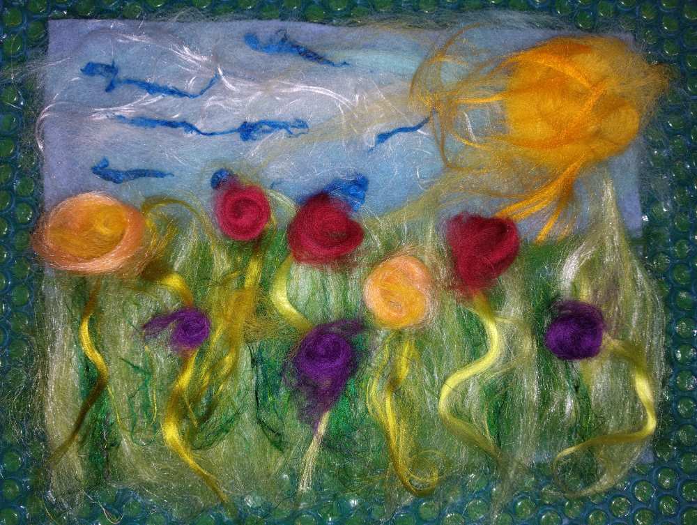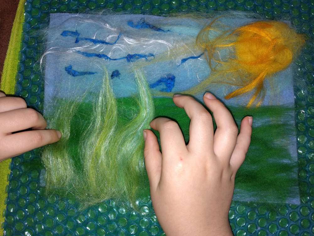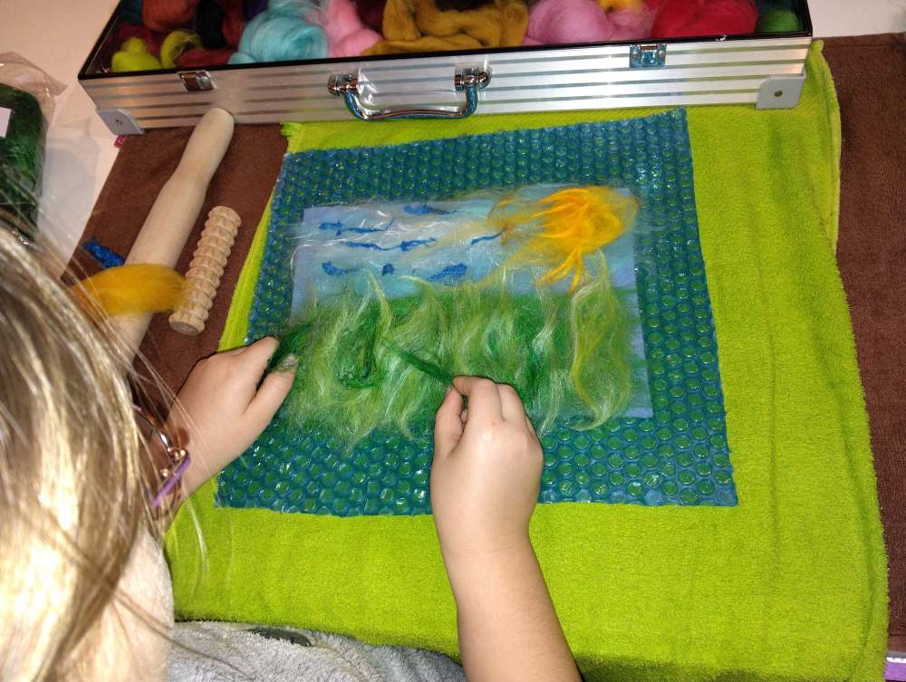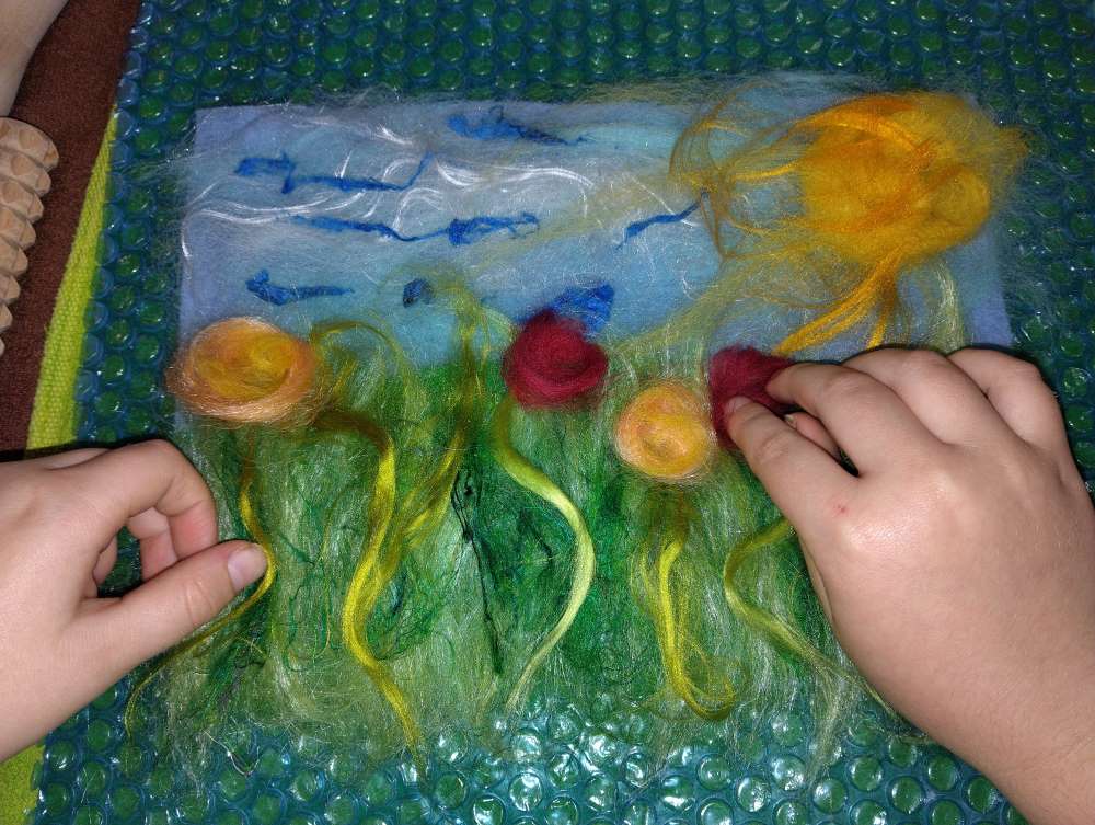 Voici les étapes de réalisation d’un petit tableau textile, en feutrant de la laine de mouton et autres fibres d’embellissement (fibres de soie, bambou), simplement grâce à du savon, de l’eau tiède, et de l’énergie !