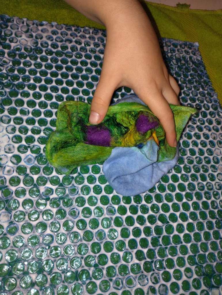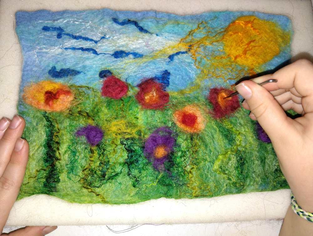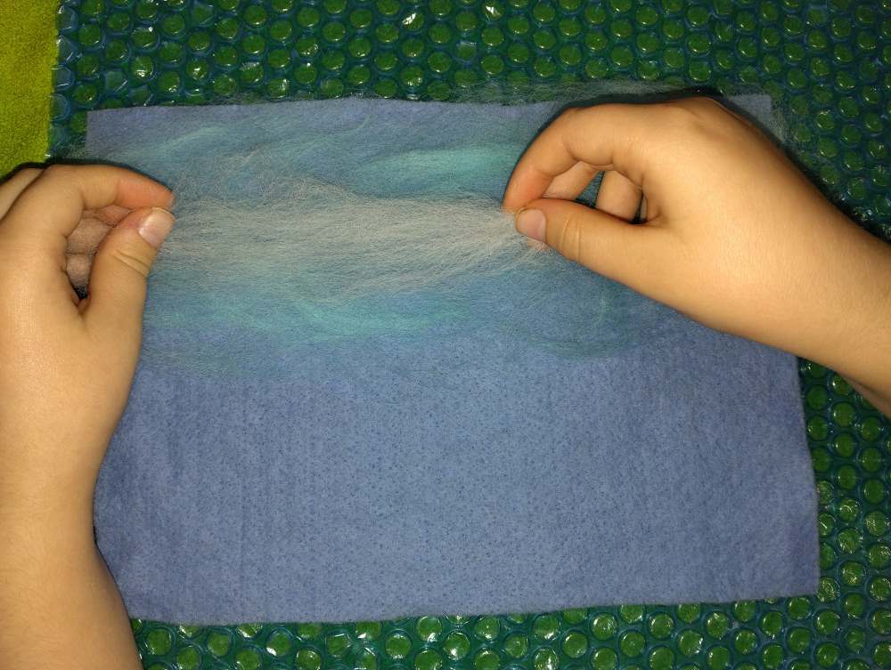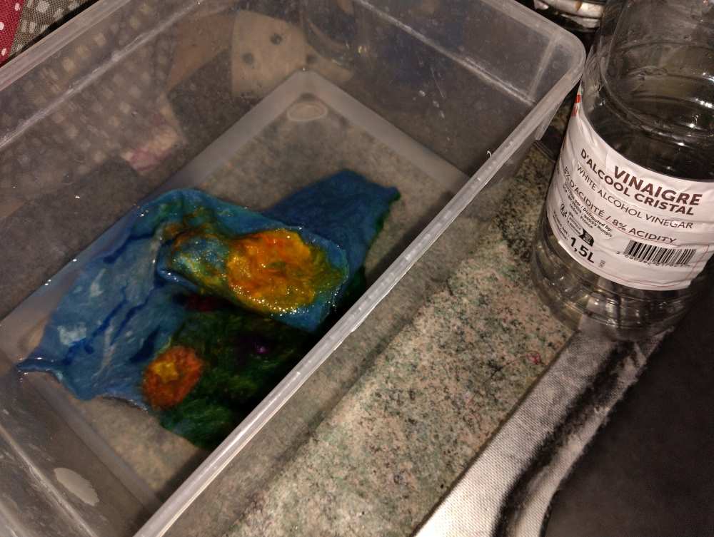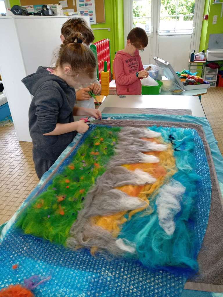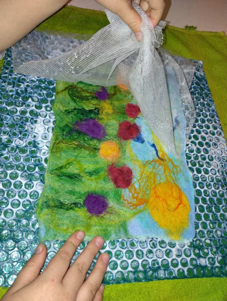 Voici les étapes de réalisation d’un petit tableau textile, en feutrant de la laine de mouton et autres fibres d’embellissement (fibres de soie, bambou), simplement grâce à du savon, de l’eau tiède, et de l’énergie !