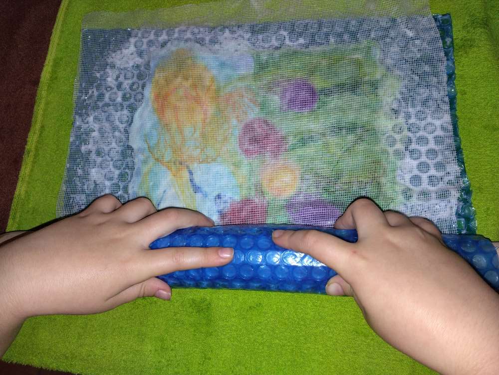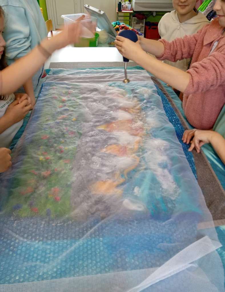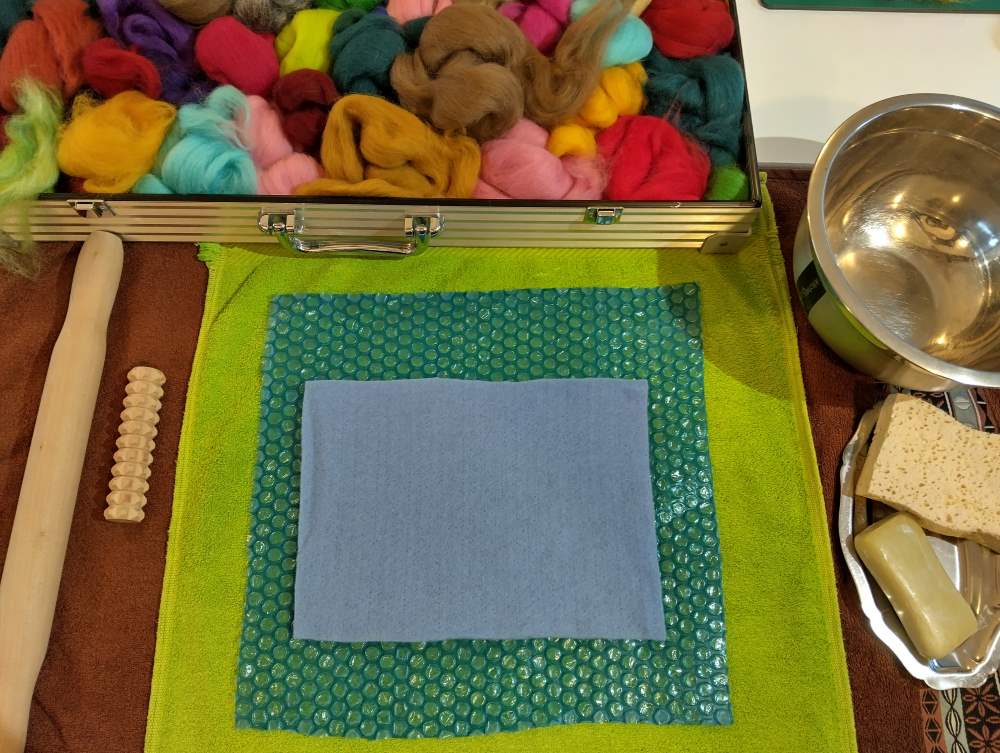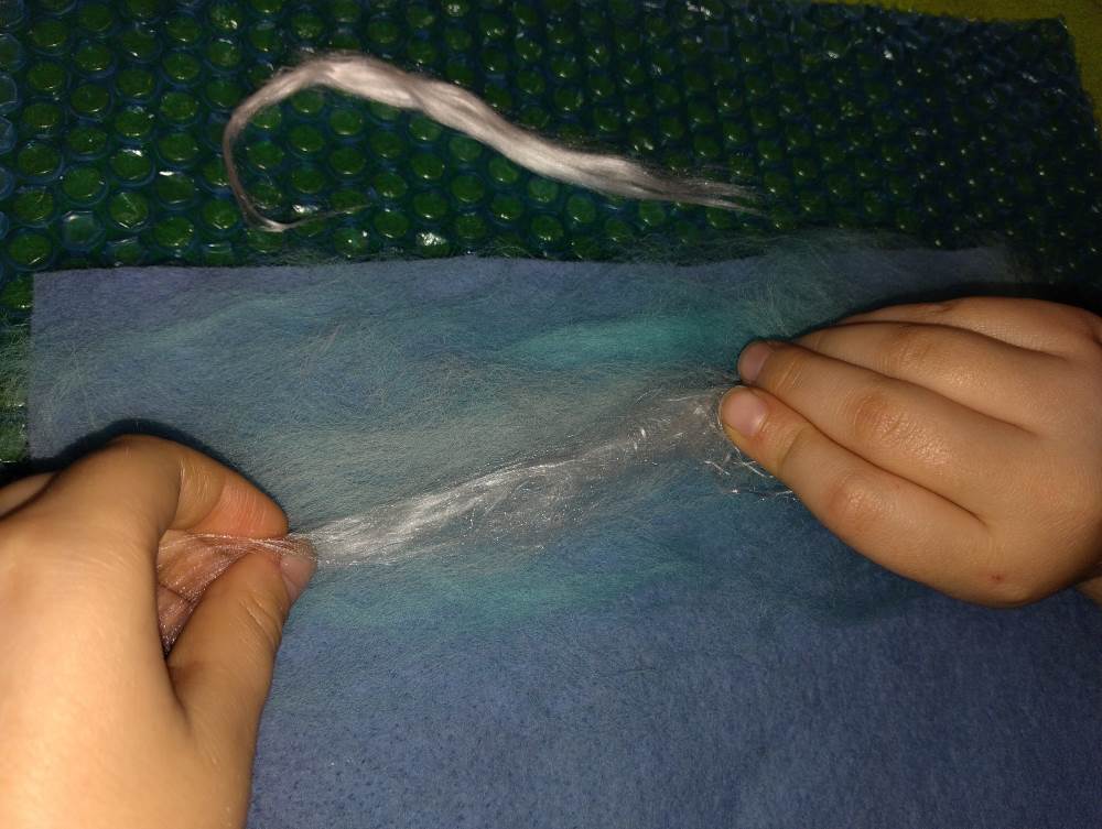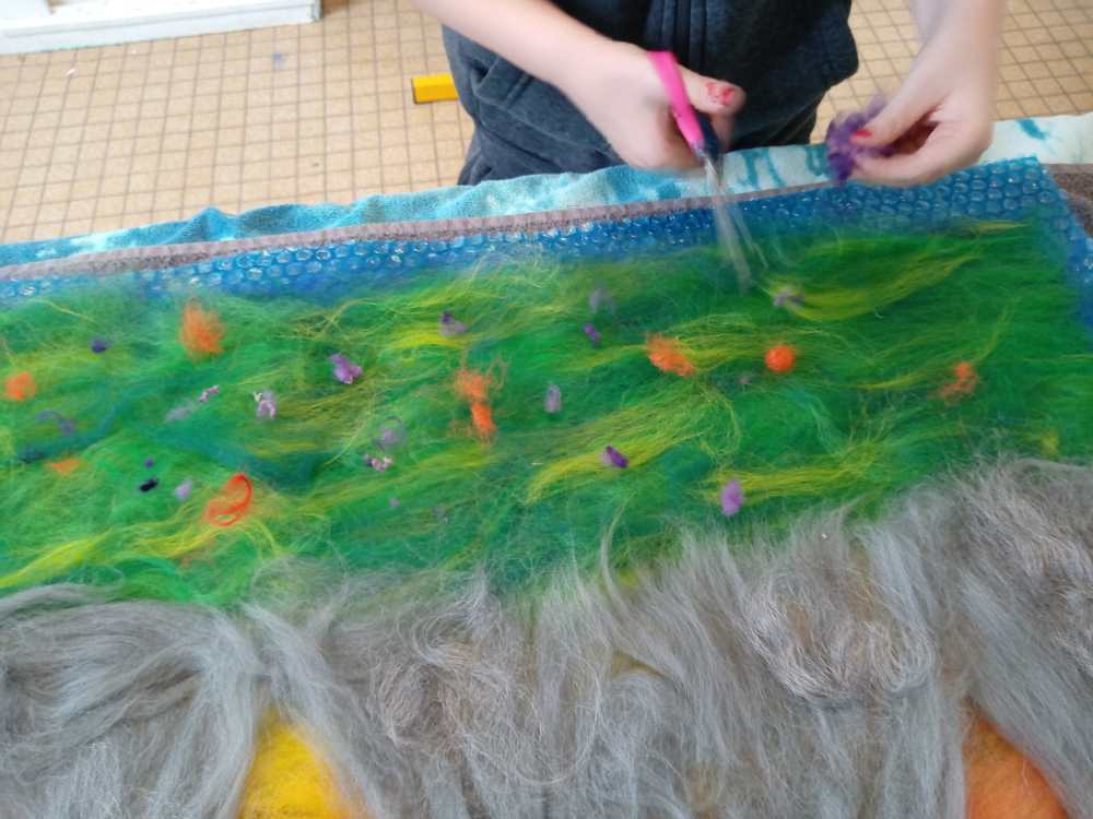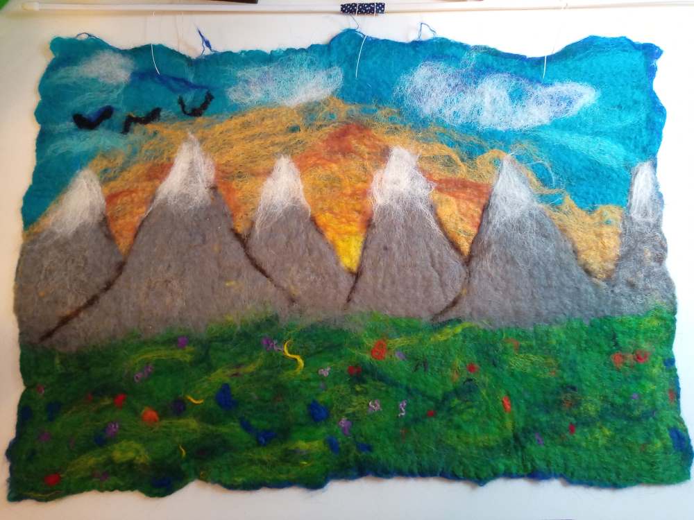 Voici les étapes de réalisation d’un petit tableau textile, en feutrant de la laine de mouton et autres fibres d’embellissement (fibres de soie, bambou), simplement grâce à du savon, de l’eau tiède, et de l’énergie !