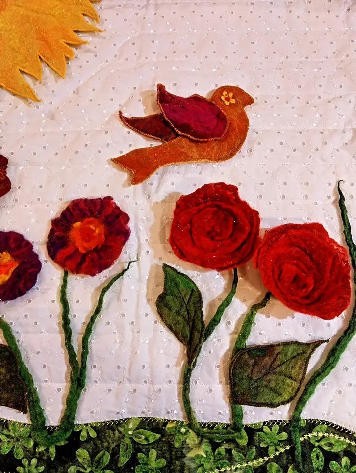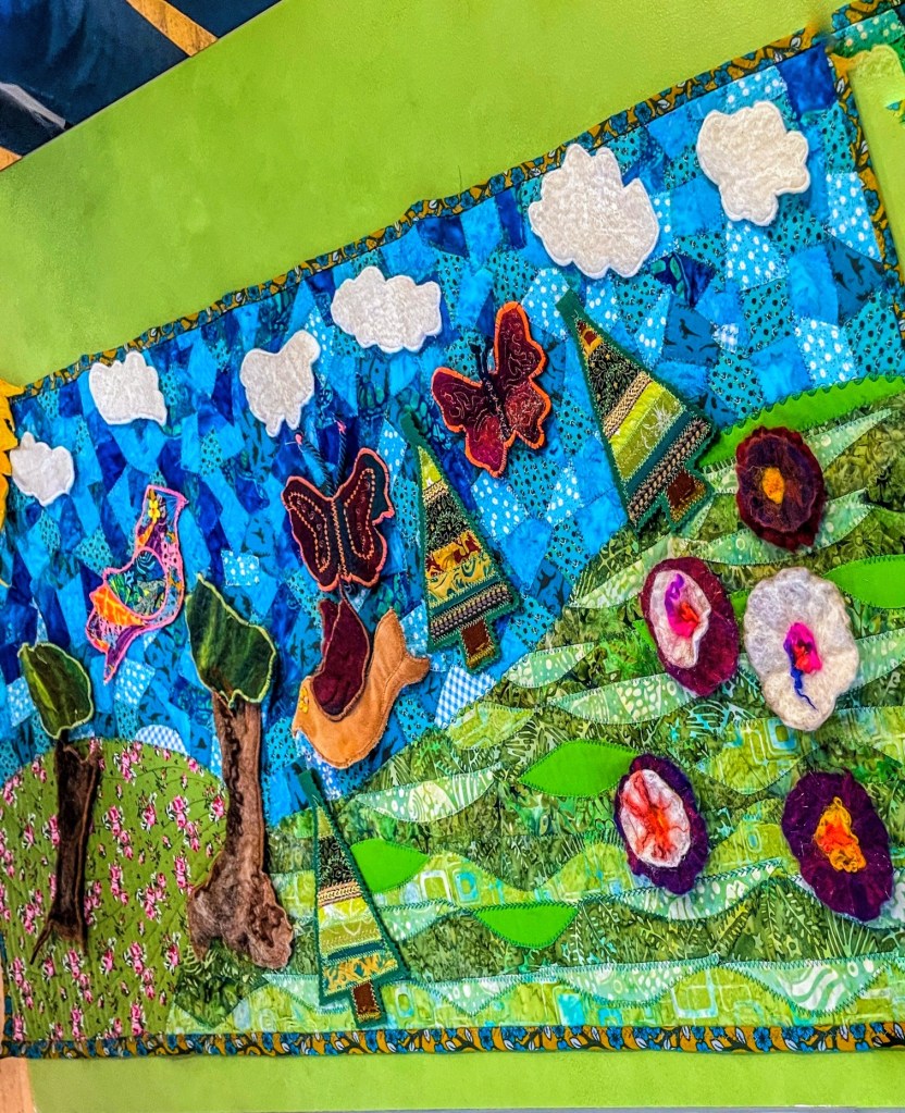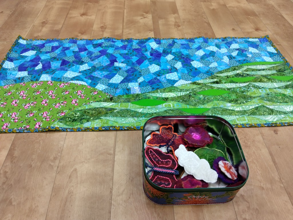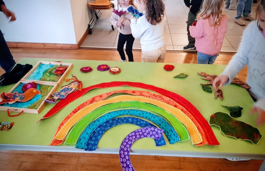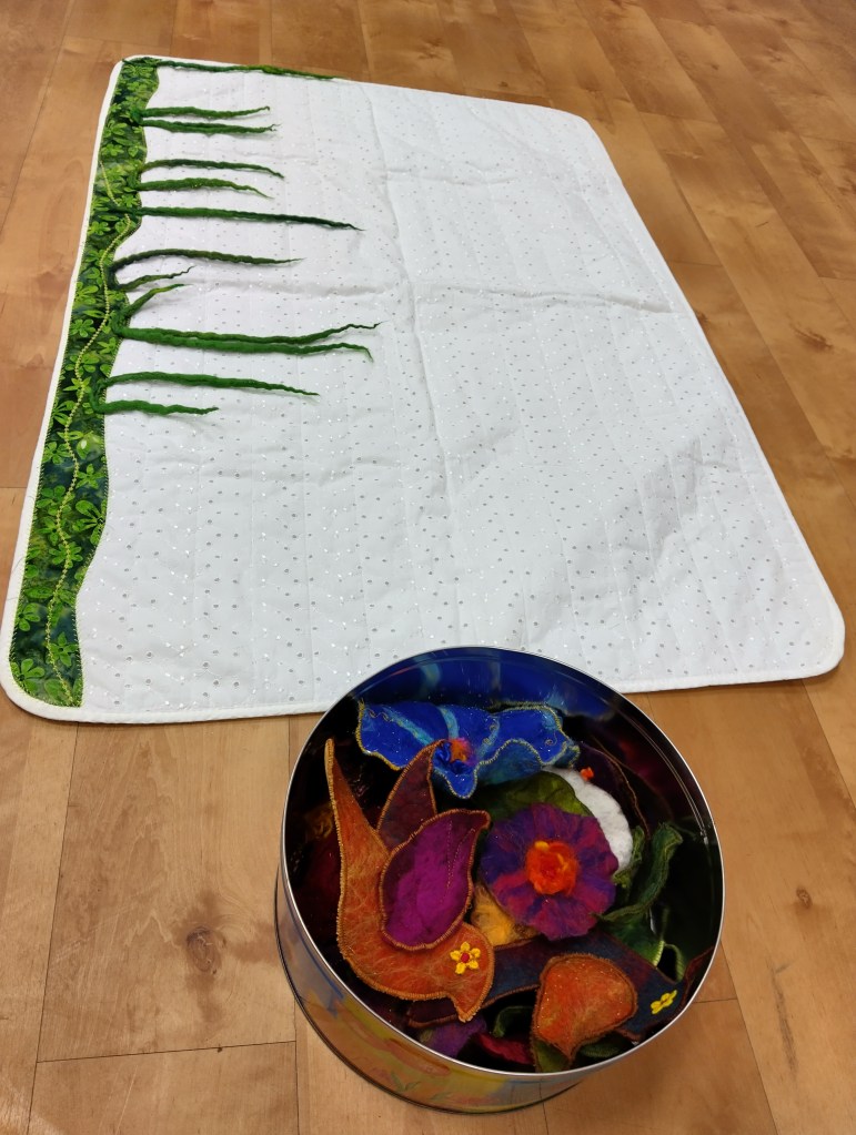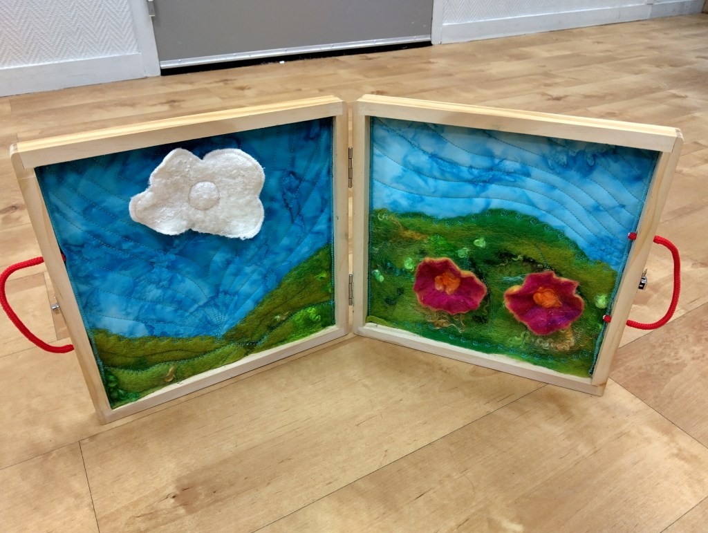 En complément du spectacle La Colline aux mille Fleurs pour les 0-6 ans, les enfants sont invités à manipuler des éléments en tissu et laine feutrée que j’ai réalisés. Ils peuvent ainsi composer des tableaux textiles, jouer et reproduire des scènes liées au spectacle.