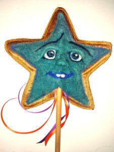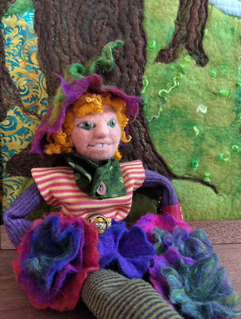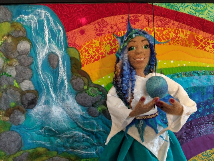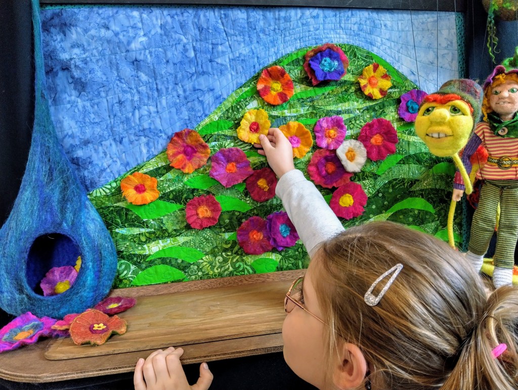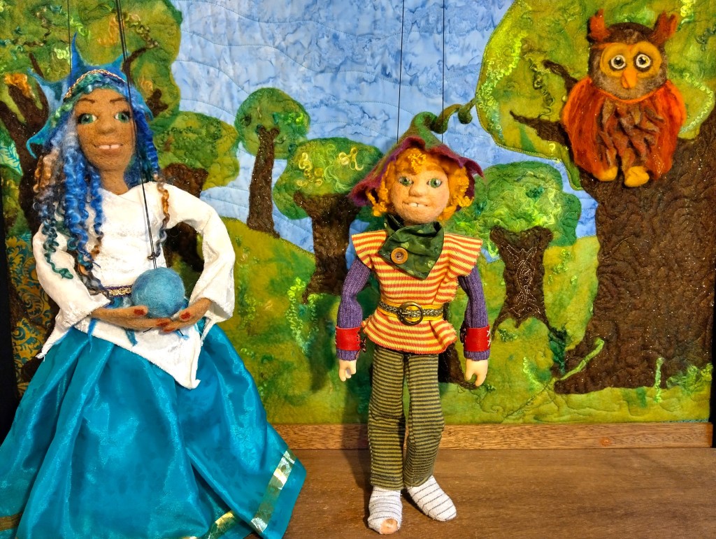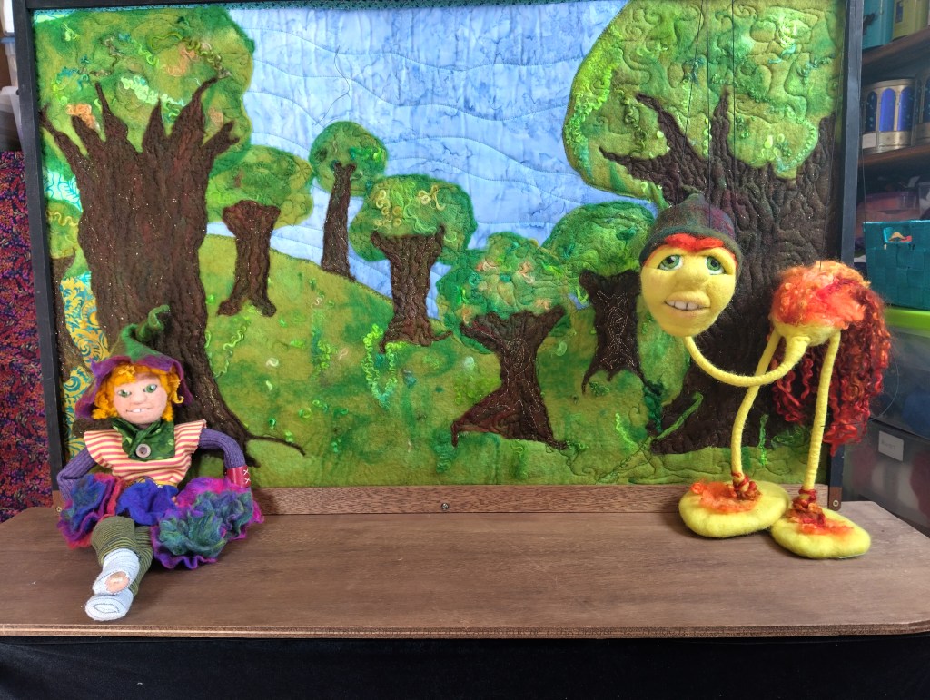 Décor déroulant et marionnettes en tissu et laine feutrée.