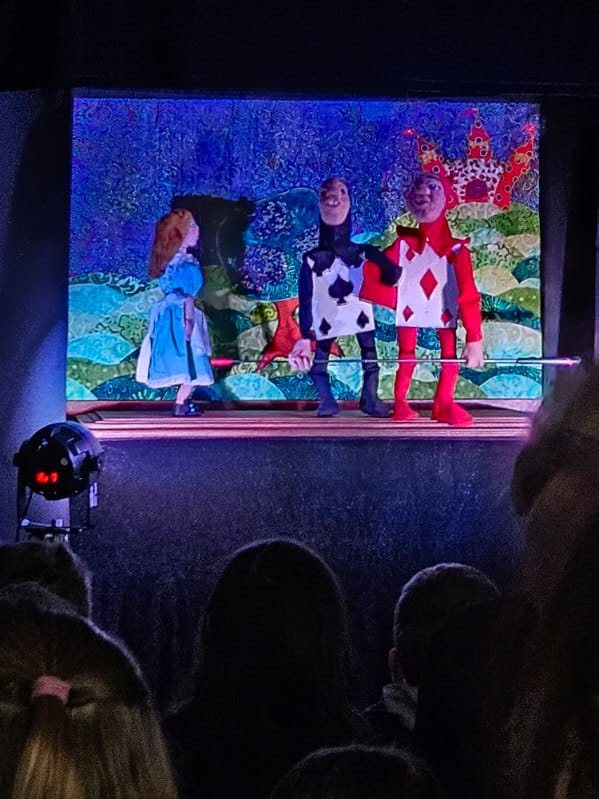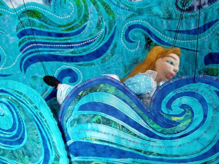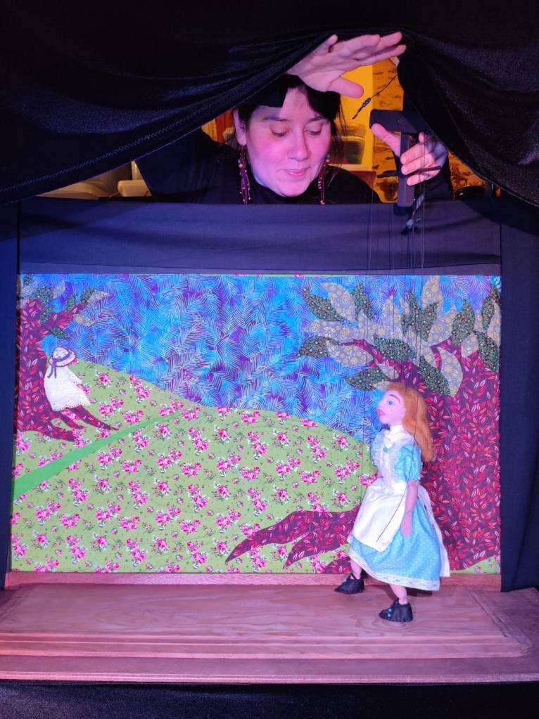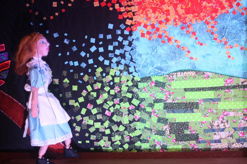 Décor en patchwork de 9 mètres de long, se déroulant selon les scènes de l’histoire, en arrière plan des marionnettes. Spectacle tout public.